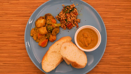 首度挑戰南洋風料理!也是我第一次擔任主廚,真的是既期待又緊張。這次負責南洋咖哩佐法式長棍麵包以及素肉骨茶,這兩道菜完全是我沒做過的料理。一開始選用綠咖哩,沒想到綠咖哩粉太辣了,辣到難以下嚥,馬鈴薯跟紅蘿蔔也沒燉爛,所以試菜的時候宣告失敗。後來決定改用黃咖哩,辣度剛剛好也具有濃厚的南洋風味,在前一天先把咖哩燉好,讓食材入味。素肉骨茶也是全新的嘗試,第一次喝到白胡椒風味的肉骨茶,也發現肉骨茶包其實可素食。